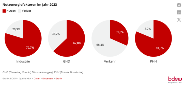 Der Verkehr hat in Deutschland seinen Endenergiebedarf als einziger Verbrauchsbereich erhöht. 2023 wurden hier rund 6 Prozent mehr Energie verbraucht als 2021. Der hohe Bestand an Fahrzeugen mit Verbrennungsmotoren sorgt in diesem Bereich für sehr schlechte Effizienzen: Nur 32 Prozent der eingesetzten Energie wird im Verkehr in Nutzenergie – in Form mechanischer Energie – umgesetzt. Hier könnte nur der weitere Ausbau der Elektromobilität zu einer Wende führen, da Elektromotoren deutlich höhere Wirkungsgrade als Verbrennungsmotoren aufweisen.