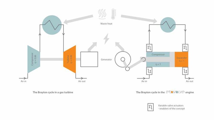 Die neue etavalve-Kolbenmaschine arbeitet ebenfalls nach dem Gasturbinenprozess, wobei aber Kolbenzylinder die Turbinentechnik ersetzen. Denn Kolbenmaschinen komprimieren und expandieren auch bei kleinen Leistungen und auch im Teillastbereich nahezu isentrop. Somit liefert eine derartige Maschine, je nach Temperatur, einen Wirkungsgrad zwischen 30 % und 45 %. Die Regelung kann hochdynamisch, im Prinzip von Zyklus zu Zyklus, erfolgen. Des Weiteren ist eine Kolbenmaschine äußerst kosteneffizient auf eine gewünschte Nennleistung skalierbar via Drehzahl, Zylindergröße, und Zylinderzahl.