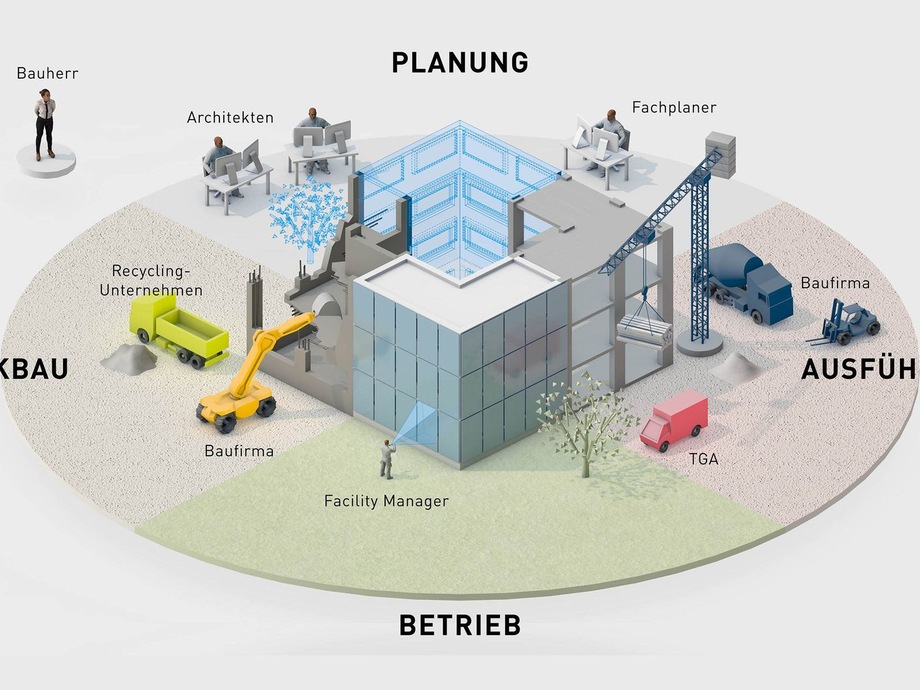 Wer den Bausektor nachhaltiger und bestenfalls zirkulär gestalten will, braucht Daten – Building Information Modeling ist hierfür die geeignete Methode. BIM ermöglicht es, den Lebenszyklus eines Gebäudes digital abzubilden und Daten zentral zu hinterlegen, die für Nachhaltigkeit im Bau, bei der Bewirtschaftung und beim Rückbau von Bedeutung sind. Das können u.a. Informationen zur Energieeffizienz der technischen Gebäudeausrüstung (TGA) sein, oder auch Daten zu den verwendeten Baustoffen, wie Stahlbeton oder Holz – diese sind u.a. relevant im Hinblick auf eine spätere Trennung der Stoffe für die Wiederverwendung und auch in Bezug darauf, wie viel CO2 darin gebunden ist.