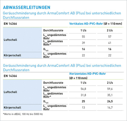 Reduzierte Abwassergeräusche mit ArmaComfort AB/AB Alu Plus: bis zu -16 dB(A) an senkrecht laufenden und -24,5 dB(A) an waagerecht laufenden Rohrleitungen, gemäß CSTB-Prüfungen nach EN 14366 bei einem Wasserdurchfluss von 2 l/s.