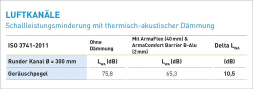 Durch die Installation eines thermisch-akustischen Dämmsystems aus 40 mm ArmaFlex und 2 mm ArmaComfort Barrier B-Alu auf der Außenseite des Kanals lässt sich dieser Pegel voraussichtlich auf etwa 51,5 dB(A) senken, was einer Halbierung des wahrgenommenen Geräuschpegels entspricht.
