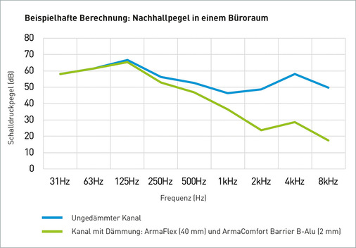 Ein praxisnahes Beispiel zeigt, welchen Einfluss eine fachgerechte Luftkanaldämmung auf die Raumakustik in einem typischen Büro haben kann. In einem Standardbüro mit den Maßen 6 m × 5 m × 3 m und üblicher Möblierung kann der der Nachhall-Schallpegel aufgrund von Körperschall aus einem ungedämmten Rundkanal von 300 mm etwa 61 dB(A) betragen.
