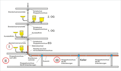 In einem Gebäudeentwässerungssystem werden häufig Kunststoffrohre als Anschlussleitung in Verbindung mit Gussrohr im Fallstrang eingesetzt. In diesem Fall kommen die brandschutztechnischen Anforderungen an eine Mischinstallation zum Tragen (Nachweis Ausführung als aBG: allgemeine Bauartgenehmigung, Nachweis Produkt als abZ: allgemeine bauaufsichtliche Zulassung). Bild 2 zeigt eine typische Mischinstallation, abgeschottet mit Brandschutzverbindern und Ringspaltverschlüssen im Deckenbereich.