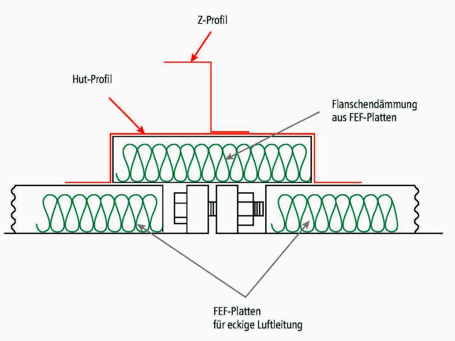 Bei der Blechummantelung von eckigen Luftleitungen, welche mit FEF-Platten gedämmt sind, ist nach DIN 4140 unter Punkt 8.3.4.5 Folgendes im Absatz 2 „Luftspalt zwischen metallenen Ummantelungen und Dämmstoff“ festgelegt: „Bei Kältedämmungen ist ein Luftspalt vorzusehen, wenn Schrauben oder Nieten die Dampfbremse beschädigen können. Der Luftspalt muss so groß sein, dass eine Beschädigung der Dampfbremse ausgeschlossen ist.“
