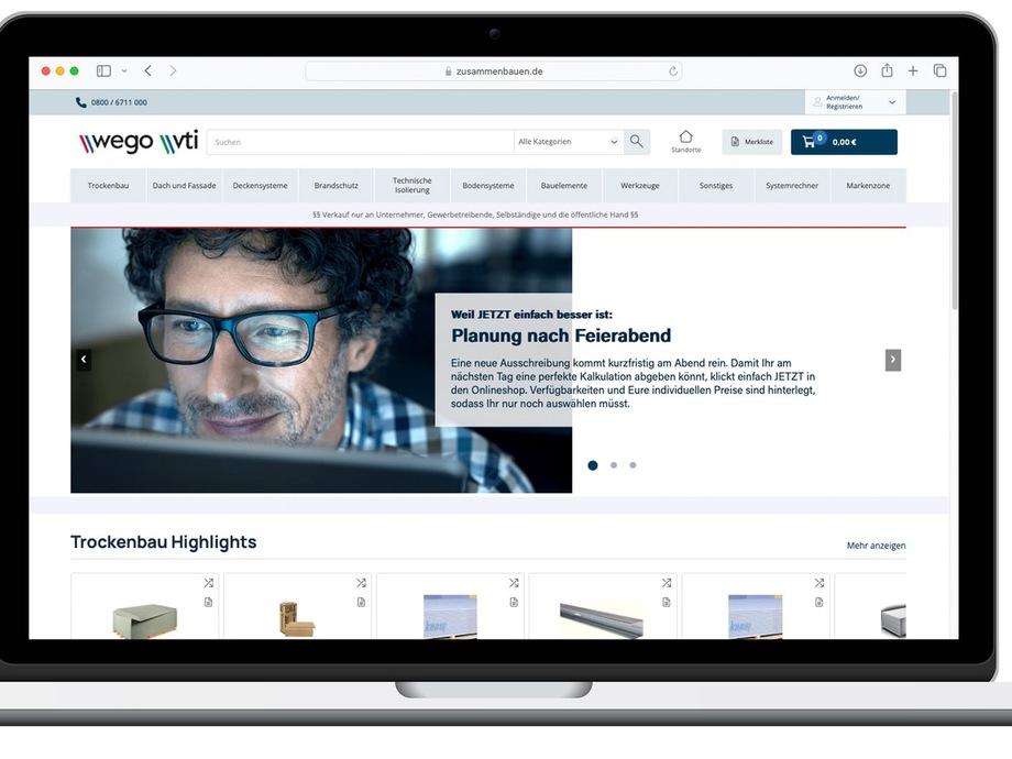 Laut Unternehmensmitteilung können ab sofort Profikunden von Wego vti über die neue Webseite unter www.zusammenbauen.de online planen und bestellen. Der neue Profi-Onlineshop bietet laut eigenen Angaben benutzerfreundliche Bedienung, schnelle Reaktionszeiten, individuelles Kundenprofil, umfassende Dokumententransparenz und eine schnelle Bestellabwicklung.